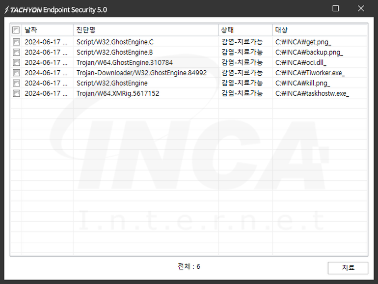 상기 악성코드는 잉카인터넷 안티바이러스 제품 TACHYON Internet Security 5.0에서 진단 및 치료가 가능하다.
