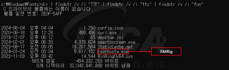 한편, ‘C:\Windows\Fonts’ 경로에 다운로드된 “smartsscreen.exe”은 “XMRig” 코인 마이너를 다운로드 및 실행해 암호화폐를 채굴한다.