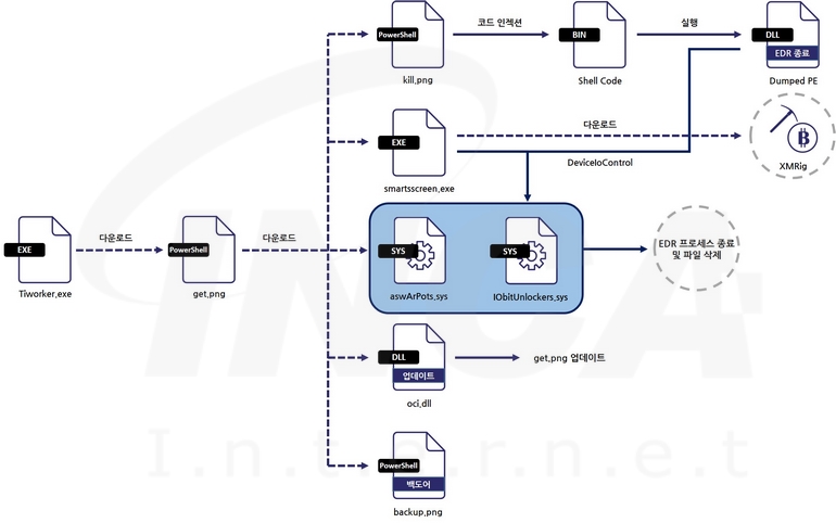 최근 “GhostEngine” 악성코드를 유포해 EDR(Endpoint Detection and Response) 프로세스를 종료하고 코인 마이너를 실행해 암호화폐를 채굴하는 캠페인이 발견됐다. 해당 캠페인은 취약한 윈도우 드라이버를 악용해 감염된 호스트에서 EDR 프로세스를 종료하고 종료된 프로세스의 실행 파일을 삭제한다. 이후, 공격자가 운영하는 C&C 서버에서 “XMRig” 코인 마이너를 다운로드 및 실행한다.