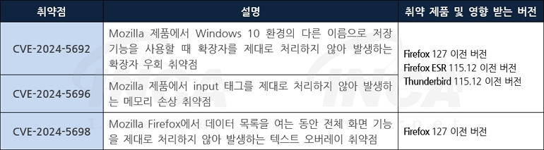 Mozilla 사는 제품에서 발생하는 취약점에 대한 보안 업데이트를 발표하고, 관련 취약점을 해결하기 위해 최신 버전으로 업데이트할 것을 권고하였다.