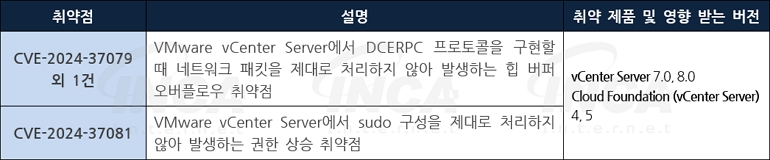 VMware 사는 제품에서 발생하는 취약점에 대한 보안 업데이트를 발표하고, 관련 취약점을 해결하기 위해 최신 버전으로 업데이트할 것을 권고하였다.