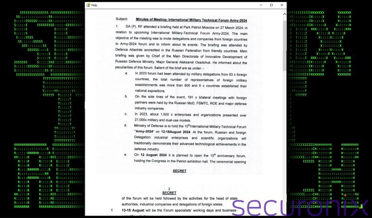 보안 업체 Securonix에서 PHANTOM#SPIKE로 명시한 해당 캠페인의 공격자는 군사 관련 내용의 문서를 활용해 피싱 공격을 한다고 말했다. 외신에 공유된 보고서에 따르면 이 캠페인은 정교함이 부족하고 대상 시스템에 대한 원격 엑세스를 달성하기 위해 간단한 페이로드를 사용한다는 특징이 있다고 밝혔다. Securonix는 피싱 이메일에 러시아 연방 국방부가 주최한 국제군사기술포럼 행사와 관련된 회의록으로 추정되는 ZIP 아카이브가 포함되어있다고 전했다. ZIP 파일에는 Microsoft CHM 파일과 숨겨진 실행 파일이 들어있으며, 이 파일을 열면 회의록과 몇 개의 이미지가 표시되고 사용자가 문서의 아무 곳을 클릭하면 번들 바이너리가 생성된다고 언급했다.