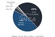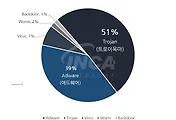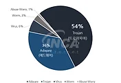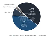 10월 한달 간 탐지된 악성코드를 유형별로 비교하였을 때 Adware(애드웨어)와 Trojan(트로이목마) 가 각각 62%, 32%로 가장 높은 비중을 차지하였고, Virus(바이러스)가 4%, Worm(웜)과 Backdoor(백도어)가 각각 1%씩으로 그 뒤를 따랐다.
