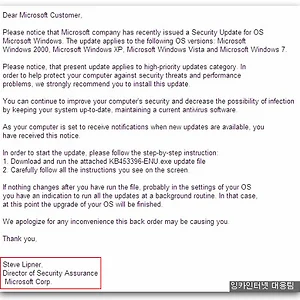 시큐리티대응센터2119 ZeuS 변종 Kneber 봇넷의 백악관 사칭 이메일을 통한 유포 주의! 1. 개 요 최근 해외에서 발신처가 백악관으로 위장된 이메일 상의 링크를 통해 ZeuS 봇넷의 변종인 Kneber 봇넷을 다운로드 및 실행을 유도하여 유포하는 사례가 보고되었다. 크리스마스 카드나 새해를 맞아 신년 연하장 등의 이메일을 통해 수신자를 속이는 유형의 악성파일 유포 사례가 늘고 있는 만큼 해당 이메일 등을 수신한 사용자들의 주의가 요구되고 있다. [ Old ZeuS Variant Returns for Christmas ] 참고 : http://blog.trendmicro.com/old-zeus-variant-returns-for-christmas/ 2. 감염 경로 및 증상 Kneber 봇넷은 아래의 그림과 같이 백악관에서 보내진 것처럼 위장된 메일을 통해 유포된 것으로 알려졌다. < 참고 사.. 2011. 1. 7. Adobe Flash Player의 정상 설치 파일명으로 위장한 허위 보안 프로그램 1. 개요 최근 "Adobe Flash Player"의 정상 설치 파일인 것처럼 위장되어 유포되어지고 있는 허위 보안 프로그램이 발견되어 졌다. 해당 허위 보안 프로그램이 사용자 PC에 설치될 경우 정상파일에 대한 허위 감염 정보나 거짓 경고 메시지를 보여주고 사용자 결제를 유도하는 것이 특징 이다. 이러한 허위백신의 진단결과에 대해서는 신뢰하지 않도록 사용자의 각별한 주의의식이 필요한 상태이다. 1-1. 사회 공학적 기법을 이용한 허위 보안 프로그램 유포 사례 관련 정보 [한글판 외산 허위 Anti-Virus 제품 주의] 출처 : http://www.nprotect.com/v7/nsc/sub.html?mode=report_view&subpage=3&no=85&page=2&field=&field_valu.. 2011. 1. 7. 2011년 1월 마이크로소프트(MicroSoft) 윈도우 그래픽 렌더링 엔진 취약점 공개 1. 개 요 해외시각으로 2011년 1월 4일 마이크로소프트(MS)사에서 윈도우 그래픽 렌더링 엔진(Windows Graphics Rendering Engine)의 제로데이(Zero-Day) 취약점이 공개되었다. 해당 취약점으로 인해 공격자는 원격지에서 특정 코드에 대한 실행이 가능하며, 관리자 권한에 대한 획득이 가능하다고 알려졌다. ◇ 참고 사이트 - http://www.microsoft.com/technet/security/advisory/2490606.mspx - http://nakedsecurity.sophos.com/2011/01/05/zero-day-windows-exploit/?utm_source=feedburner&utm_medium=feed&utm_campaign=Feed%3A+nake.. 2011. 1. 6. 악성파일 유포를 위해 Microsoft로 가장한 이메일 해외 유포 주의 1. 개 요 2011년 1월 4일경 해외 보안 업체로부터 Microsoft에서 발송된 것으로 위장된 이메일이 유포 중이라고 보고되었다. 해당 이메일은 "Update your Windows"라는 제목을 가지고 있으며, 악성파일을 첨부하고 있다. 또한, 발신처와 메일의 본문 내용이 Microsoft에서 보내진 것으로 위장되어 있으며, 첨부된 악성파일에 대한 다운로드 및 실행을 유도하고 있어 사용자들의 주의가 요구되고 있다. 참고 : [Fake Microsoft security update spreads Autorun worm] http://nakedsecurity.sophos.com/2011/01/04/fake-microsoft-update-spreads-worm/?utm_source=feedburner&u.. 2011. 1. 5. 페이스북(Facebook) 통한 스팸기능의 어플리케이션 유포 주의! 1. 개 요 최근 SNS(Social Network Service)를 통해서 다양한 정보 공유가 이루어지고 있다. SNS를 통해서 공유되는 수많은 정보 중에는 다듬어지지 않았거나 신뢰할 수 없는 정보 또한 존재하며, 이러한 정보에 대한 접근 시 뜻하지 않는 피해를 입을 수 있다. 최근 대표적인 SNS 페이스북(Facebook)을 통해 스팸 기능의 글에 대한 유포 사례가 보고되어 사용자들의 주의가 필요하다. 이번에 보고된 사례는 스팸 기능의 글에 포함된 링크를 클릭할 경우 사용자의 지인들에게 해당 글을 재유포하는 형태이기 때문에 더욱 세심한 관심이 필요하다. 2. 감염 경로 및 증상 Facebook의 담벼락을 통해 아래의 그림과 같이 "CHAT DE AMIGOS", "Grupo de Amistad" 등의 .. 2011. 1. 4. 2011년 신묘년 보안 위협에 대한 전망 지난 2010년 한 해 동안 많은 보안 위협에 따른 사고가 있었다. 해를 거듭할수록 다양하고 새로운 기법의 보안 위협이 발생하고 있기 때문에, 미래에 발생할 수 있는 보안 위협에 대한 전망 을 하고 또, 그에 따른 사전대응 방안을 마련하는 것이 보안 위협에 대비하는 최선의 방법이 되어가고 있다. 2011년에는 어떠한 보안 위협이 기다리고 있을지 지금부터 하나씩 세세하게 살펴보도록 하자. 1. SNS를 통한 악성파일 유포 2010년에는 SNS(Social Networking Service) 및 메신저를 통해 많은 악성파일 유포 사례가 있었다. 이러한 유형의 SNS가 악성파일 유포를 위한 목적으로 주로 사용되는 이유 는 우선 많은 사용자들이 SNS를 사용하고 있다는 점, 메신저를 통한 지인 사칭 및 단축주소.. 2011. 1. 3. 이전 1 ··· 345 346 347 348 349 350 351 ··· 354 다음