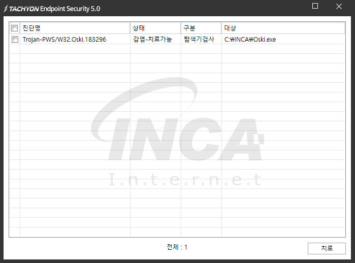 상기 악성코드는 잉카인터넷 안티바이러스 제품 TACHYON Endpoint Security 5.0에서 진단 및 치료가 가능하다.