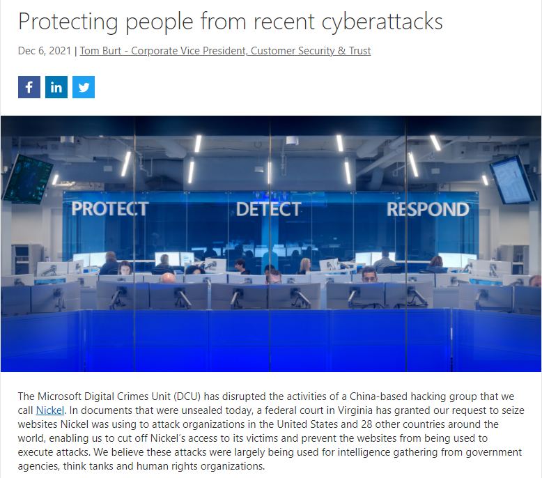 APT15, Vixen Panda 등의 이름으로 알려진 Nickel 해커 그룹은 미국을 비롯한 전세계를 대상으로 정보 탈취 공격을 수행한 것으로 알려졌다. 그런데 최근 마이크로소프트는 해당 해커 그룹이 공격에 사용하는 42개의 웹사이트를 압수하였다고 발표하였다.