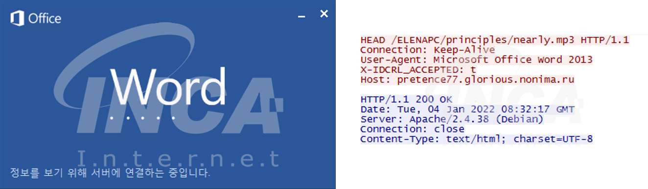 위와 같이 문서는 정부기관에서 보낸 것으로 위장하였지만, 하단의 이미지처럼 문서 파일을 열면 원격지와 연결을 시도하고, 원격지에 연결하여 파일 다운로드하는 것을 확인할 수 있다. 현 시점에는 해당 URL에 연결되지 않는다.