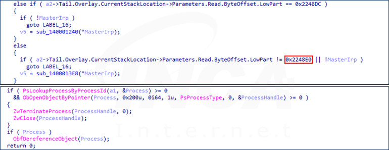 드라이버 로드 이후 현재 프로세스 목록을 확인하며 윈도우 디펜더 프로세스인 “MsMpEng.exe”를 비롯해 보안 프로그램의 프로세스를 찾아 PID값을 확보한다. 이후 NsecKrnl 드라이버(402.sys)에 DeviceIoControl 함수로 IOCTL 코드(0x2248E0)와 PID를 전송하고 드라이버에서 해당 IOCTL 코드를 전달받으면 PID에 해당하는 프로세스를 관리자 권한으로 종료한다.
