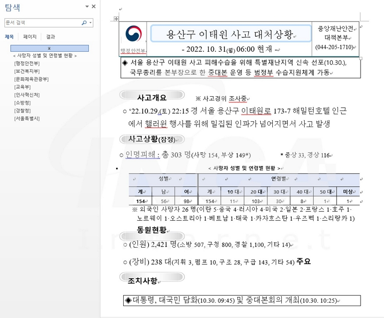 이태원 참사에 대한 내용의 문서는 ‘21031 ★서울 용산 이태원사고 대처상황(18시).docx’ 이름으로 아래와 같은 내용으로 유포되었다.