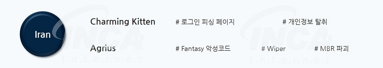 Charming Kitten 해커 그룹은 피싱 공격을 통해 계정을 탈취하고 개인 정보를 수집하였으며, Agrius 해커 그룹은 공급망 공격에서 Fantasy 와이퍼 악성코드를 사용하였다.