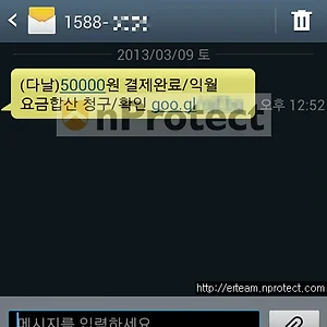 1. 소액결제사기는 지능화 중, 스미싱 경계경보! 안드로이드 기반 스마트폰 이용자를 노린 스미싱(Smishing) 사기범죄가 갈수록 다양화, 지능화되고 있는 한편 공격수위도 폭발적으로 증가하고 있는 추세이다. 그로 인해 많은 스마트폰 이용자들의 피해가 급증하고 있어 잉카인터넷 대응팀은 자체 비상 경계경보 상태를 유지하고 있다. 2013년 03월 09일, 공휴일 모바일 보안관제를 진행하던 중 새로운 사기수법을 추가적으로 발견하였다. 이 방식은 마치 실제 정상적인 소액결제 내용처럼 문구내용을 사칭하는 등 문자메시지(SMS) 수신자들의 호기심과 심리를 교묘히 역이용했고, 스마트폰 이용자들이 소액결제사기용 변종 악성앱(APK)에 좀더 쉽게 접근하고 감염되도록 현혹시키고 있다. 특히, 기존에 널리 알려져 있는 소..