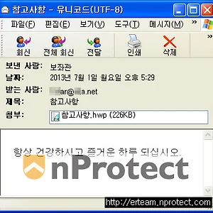 한컴 취약점1 [주의]통일연구 및 무역관련 기관을 겨냥한 표적공격 다수 발견 1. 한컴오피스 문서파일(HWP/CELL) 취약점을 이용한 불청객 이메일잉카인터넷 대응팀은 상시 보안관제 중 2013년 07월 01일부터 10일까지 한국내 통일연구 및 무역관련 기관을 집중적으로 노린 지능화된 표적공격 정황을 다수 포착하였다. 이번 공격은 한글과컴퓨터사의 한컴오피스 문서파일 취약점을 공통적으로 사용한 특징이 있으며, HWP 파일뿐만 아니라 CELL 파일 취약점도 이용되었다. 또한, 일부는 PDF 문서파일처럼 아이콘을 조작한 실행파일(EXE) 스타일의 악성파일도 함께 발견되는 등 다양한 기법이 동원되었다. 특히, 이메일의 보낸 사람 이름에 "보좌관" 이라고 표기하거나 마치 중요한 업무내용처럼 관련 문구를 포함시킨 사례도 확인되었다. 이는 수신자로 하여금 좀더 안심하고 신뢰할 수 있는 이메일.. 2013. 7. 11. 이전 1 다음